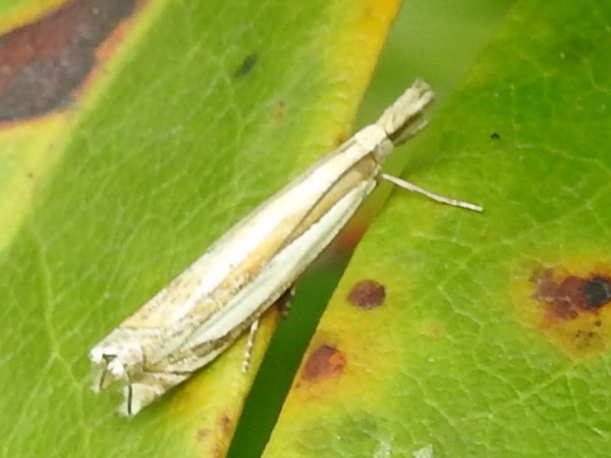 Wat is het moeilijk om deze micro's op naam te brengen. Zou dit een Crambus pascuella kunnen zijn? In juni op foto gezet in tuin in Waalre.