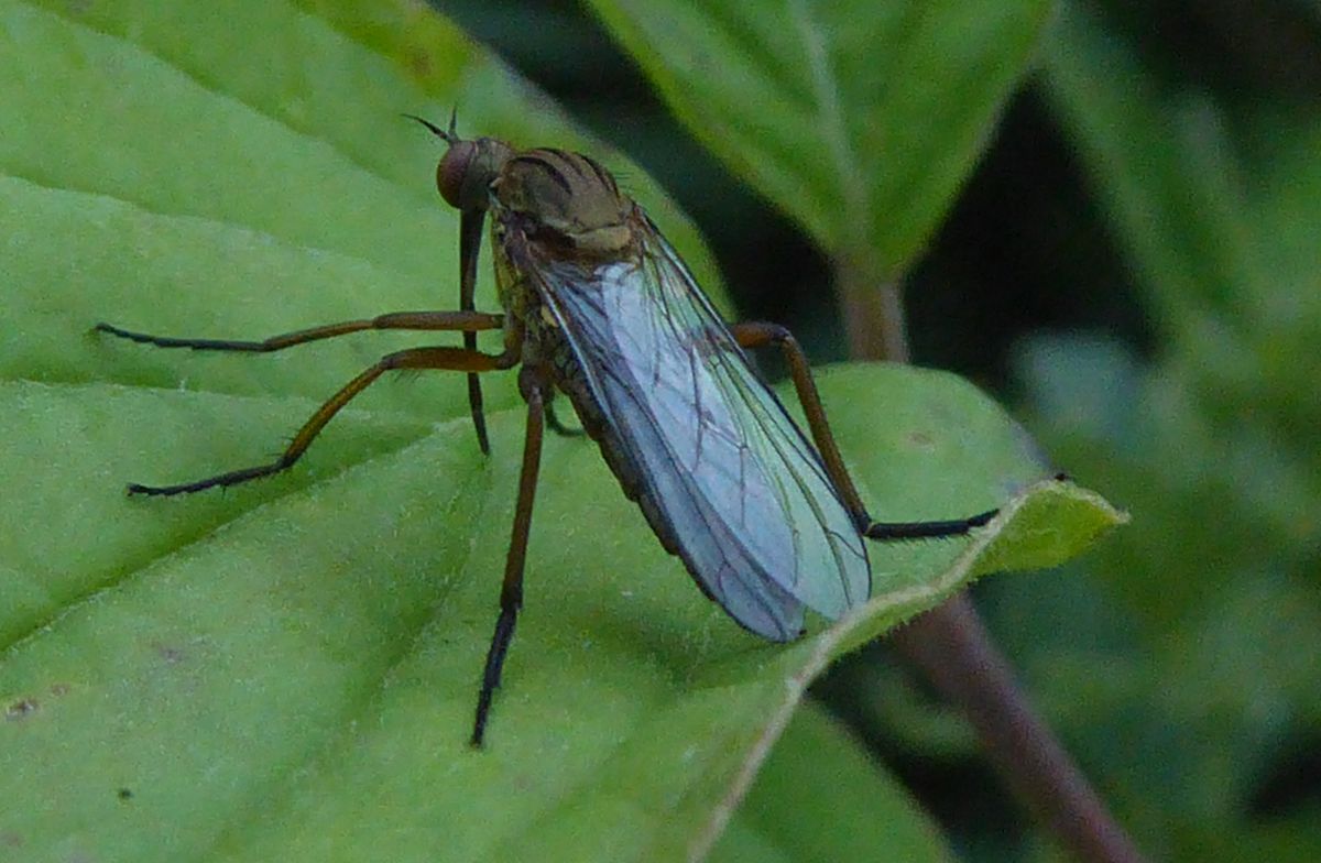 Vanmorgen aangetroffen op (waarschijnlijk) blad els. Er stond verder veel riet, braam, akkerdistel, grote brandnetel. Al zoekend kwam ik bij Empididae (dansvliegen) uit. Borststuk donkerbruin met zwarte strepen (inkepingen), aan de zijkant wat behaard; bruinzwart behaarde poten. Er leek een metaalac...
