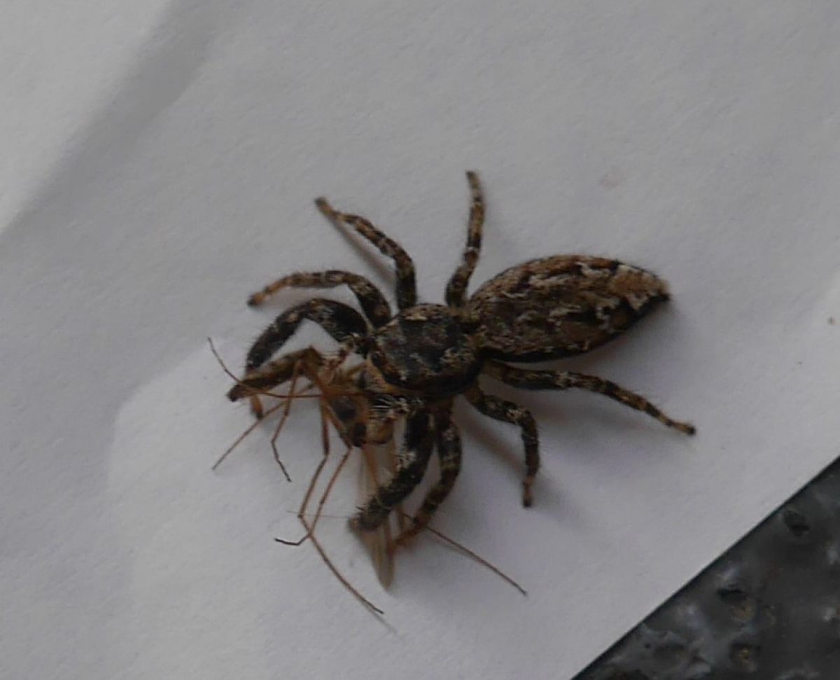 Weet iemand om welke spin dit gaat? Hij is in een bananendoos gevonden en later nog één. Ze zijn ongeveer twee cm groot, bruin met gele strepen op de poten, het lijf was bruin met een geen en wit patroon op de kont. Er waren duidelijk een soort van tanden te zien. De poten waren harig. De bananen...