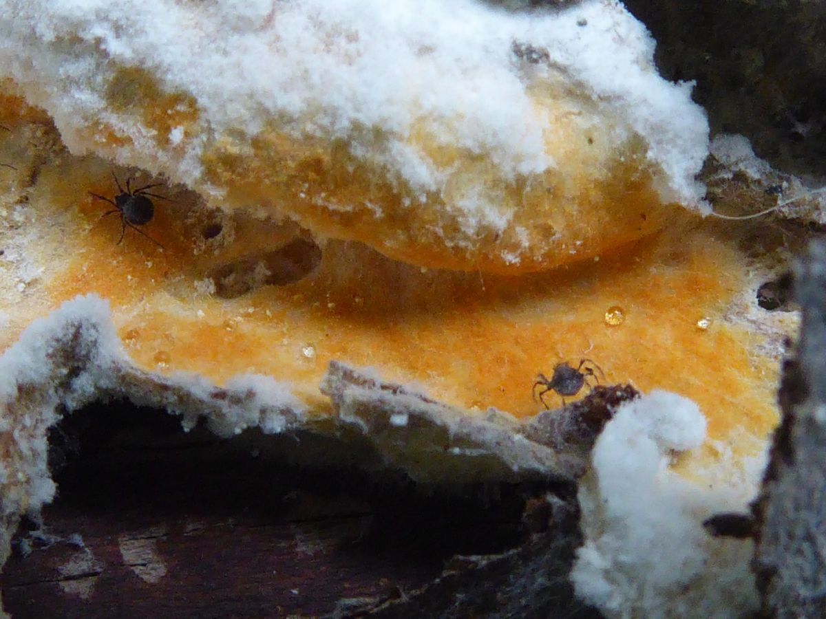 Vandaag fotografeerde ik in Meijendel een oranje zwameter (paddenstoel die parasitair leeft op de buisjeslaag van gaatjeszwammen. Thuis zag ik op mijn pc twee spinnetjes op de zwameter. Is er mogelijk een naam aan te geven?