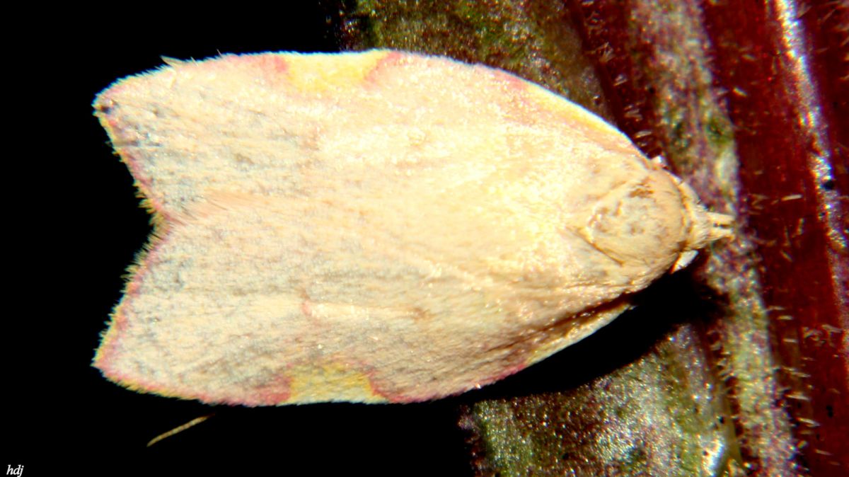 Het leek een klein bleek vlindertje, maar bij nadere beschouwing heeft het toch wel kleurtjes. Het was zo'n cm groot denk ik, misschien ietsje groter...