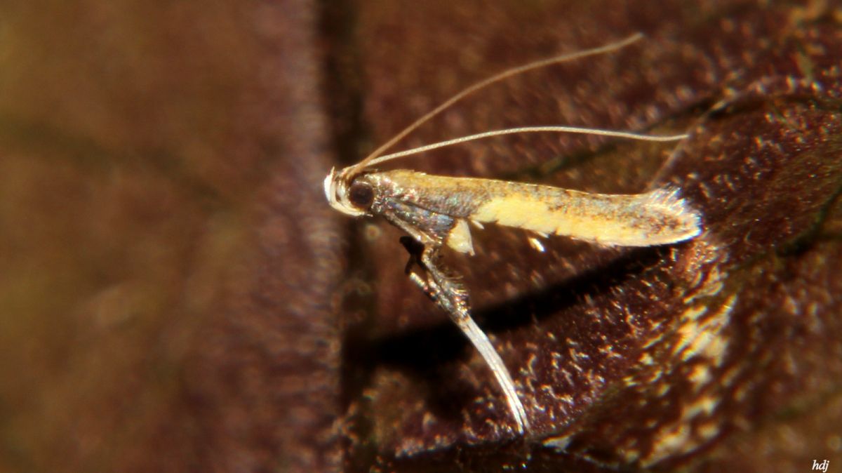 Dit kleine Motvlindertje kwam ik gisteren in mijn tuin tegen op een blad van de Ligularia.