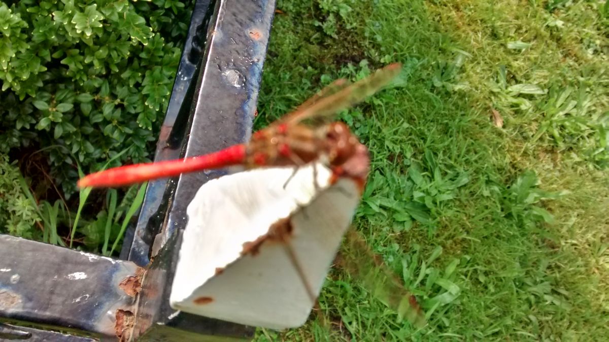 Libel op begraafplaats in binnenstad Groningen. Foto's niet heel duidelijk. Kop en borststuk bruin. Achterlijf rood (boven en onder). Bruin/rood stigma op vleugels. Ca. 7 cm. lang. Achterop het borststuk vier rode stippen (als de 4 op een dobbelsteen)