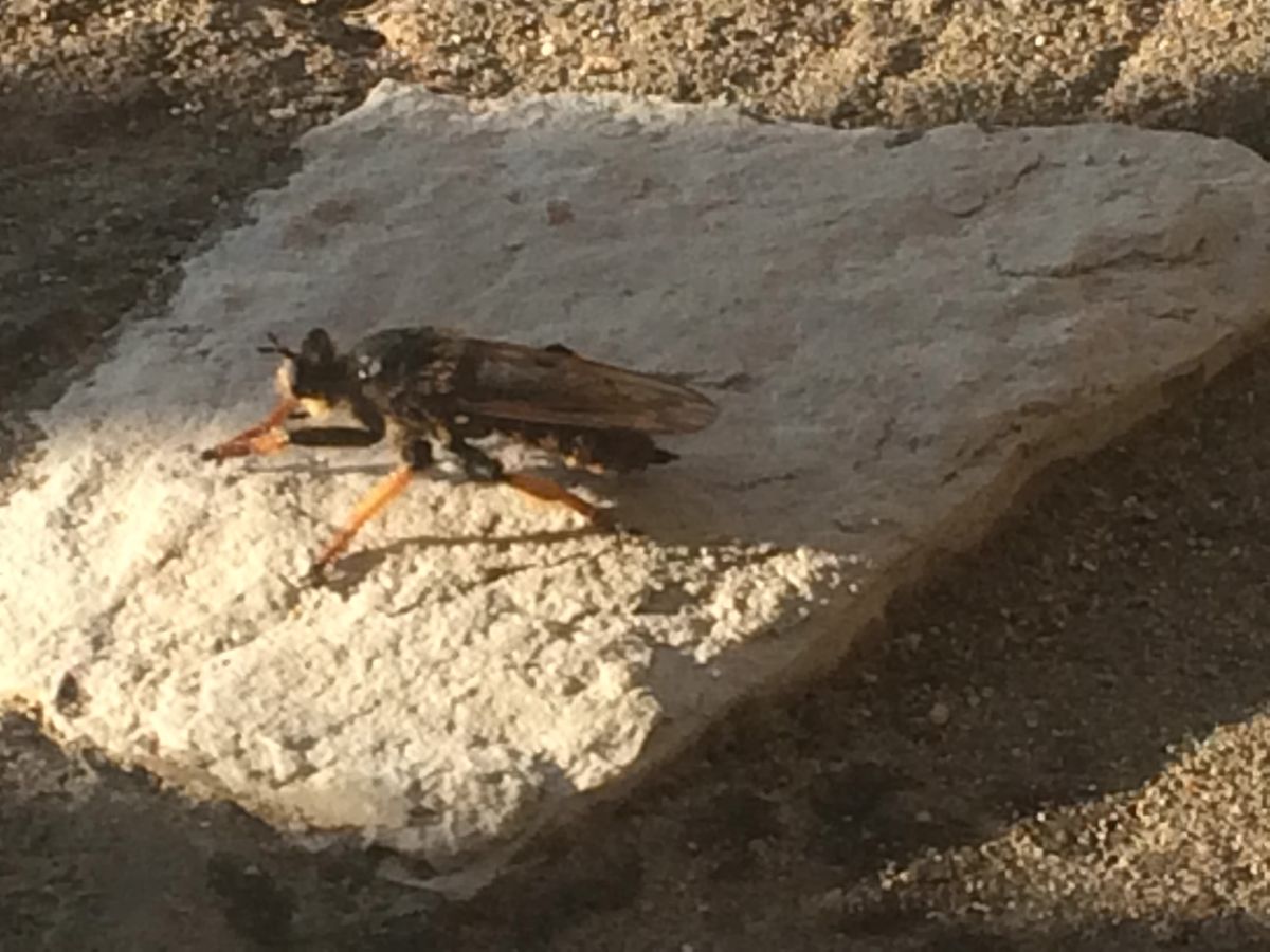 Deze grote 'wespvlieg' zagen wij op Lefkas (Griekenland). Hij is ongeveer 3 à 4 cm groot, heeft behaard zwart hoofd met sprieten. Zwartig voorlijf. Zwart/geel gestreept achterlijf. Oranje/gele harige poten. Hij eet wespen en steekvliegen. Beweegt zich snel en gericht als een vlieg. Ziet eruit als e...