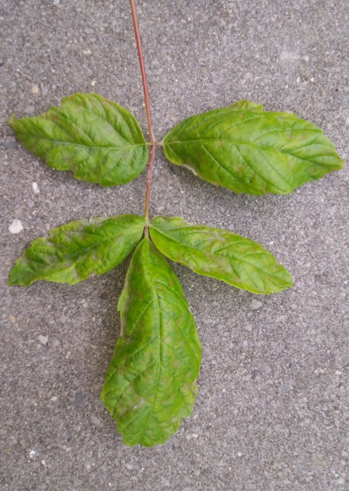 Een boom in mijn tuin heeft deze bladstructuur: 5 bladen aan een steeltje. De drie bladen aan de punt kunnen soms onderling vergroeid zijn met 2 of 3 aan elkaar.
