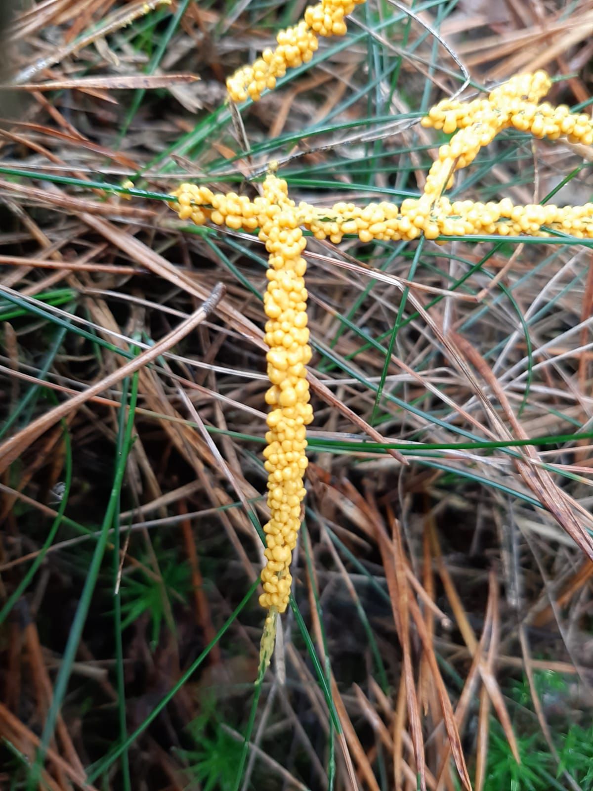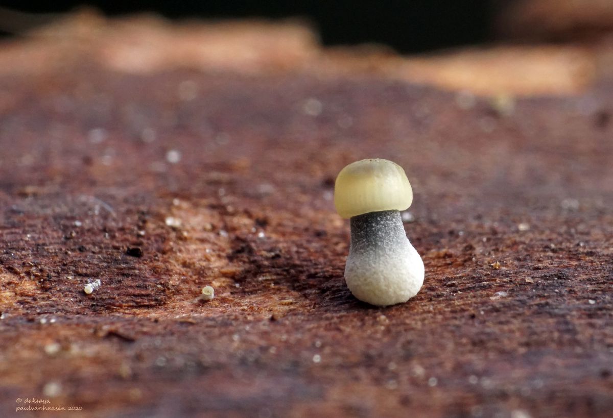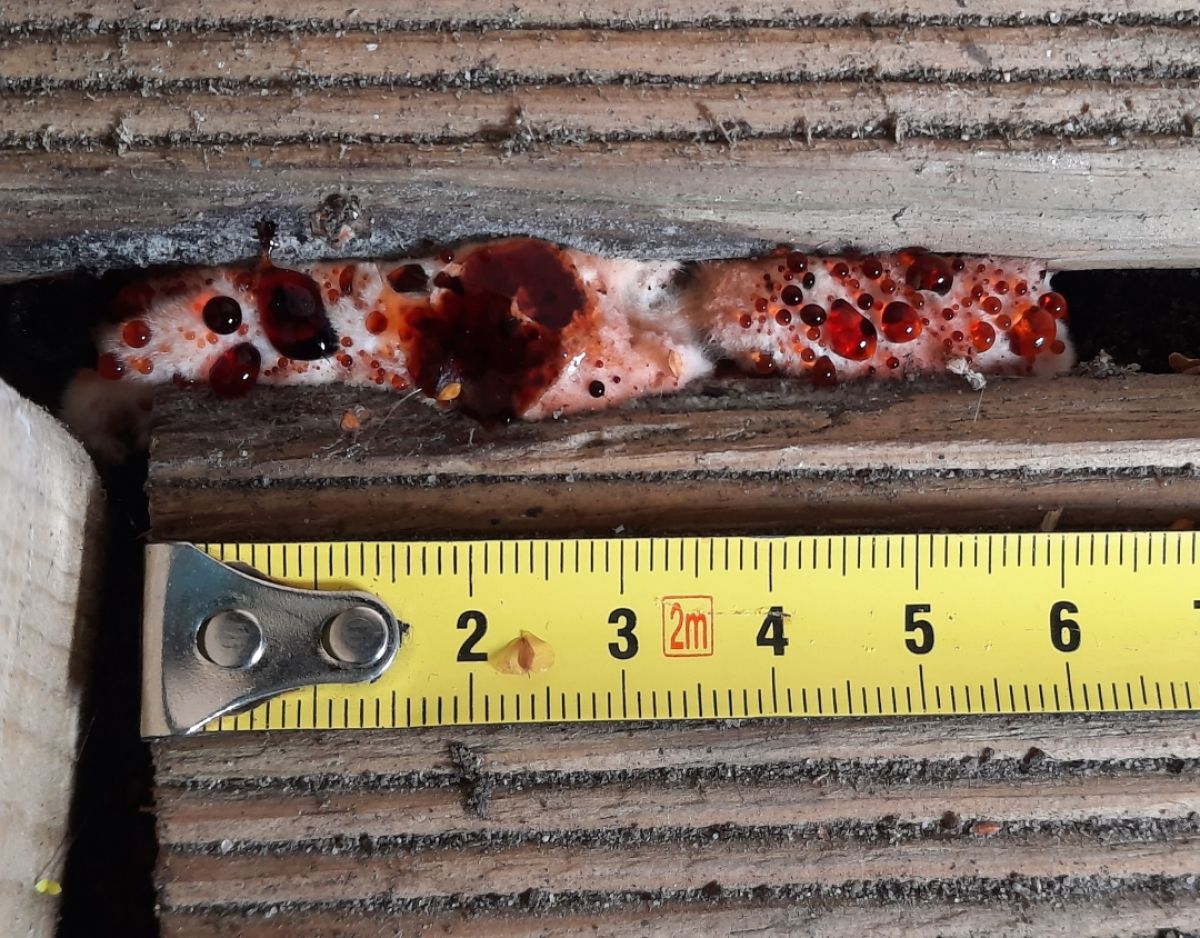 Hallo, mijn moeder vond deze schimmel groeien tussen de vloerplanken in het tuinhuisje. Na enkele dagen kwamen er rode druppels of uitstulpingen op groeien.