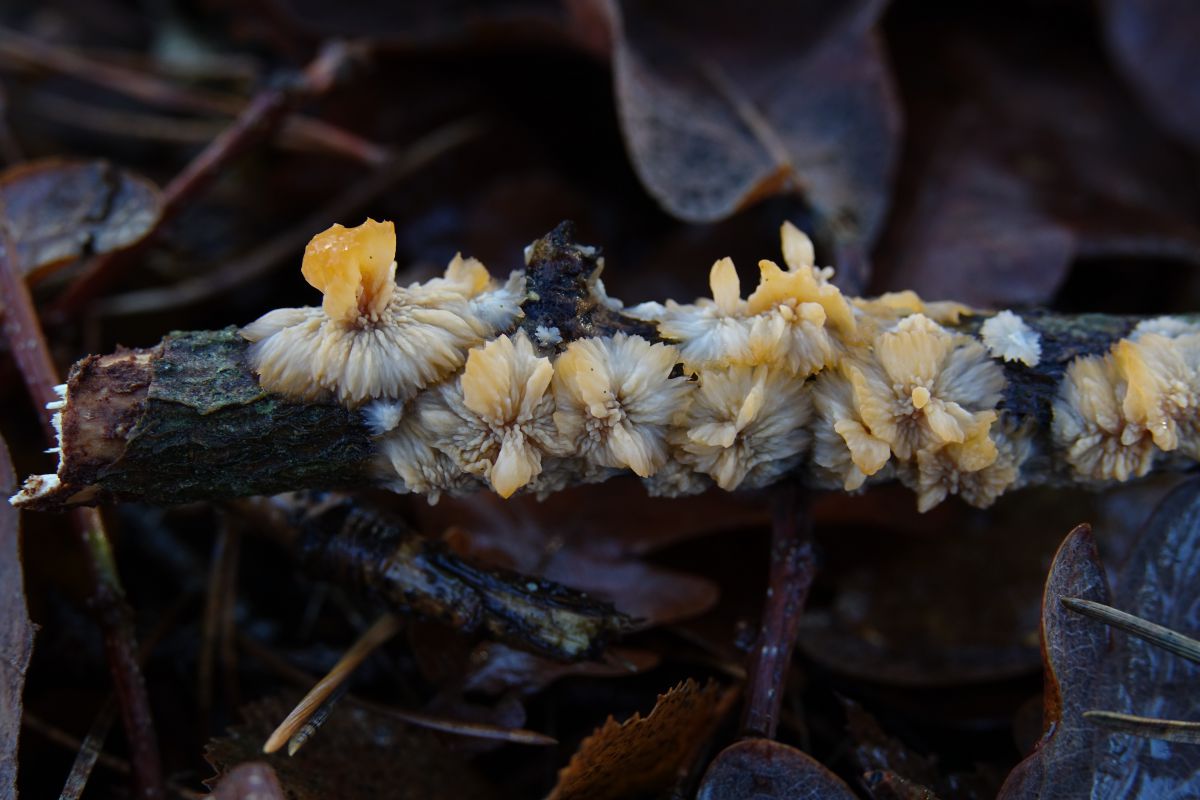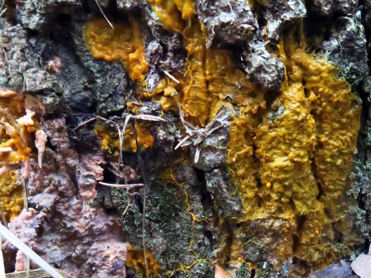 Gele draden en gele smurrie op de stam van een eik. Aan de andere kant van dezelfde stam groeit mos en daar zit de gele smurrie ook in. Wie kan mij vertellen welke zwam dit is? Gezien op landgoed De Slotplaats in Bakkeveen.