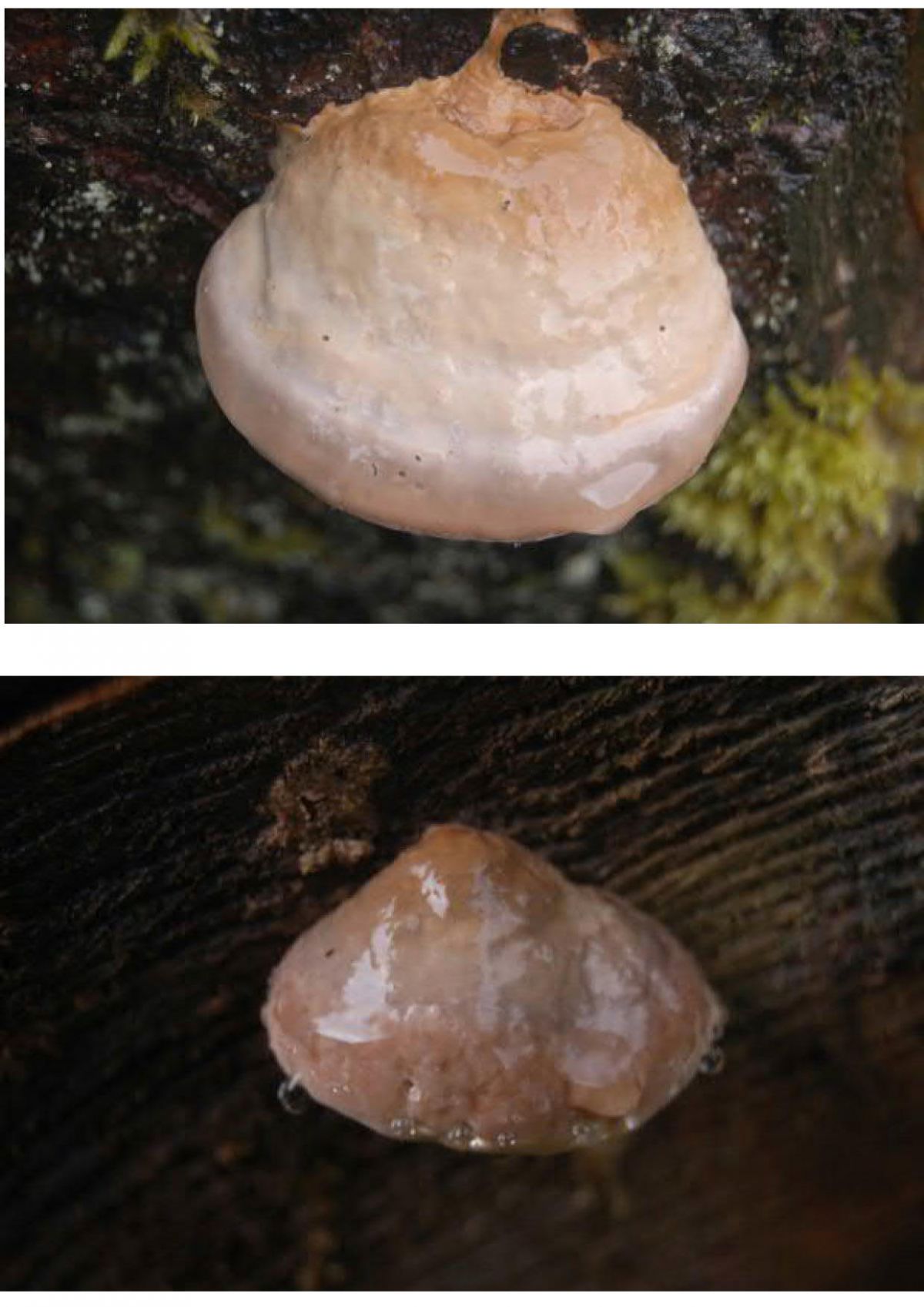 Twee verschillende zwammen. Beide met een geleiachtige laag. Foto genomen op 9 september 2017. Plaats: Stadtkyll, Eiffel. Gemengd bos.