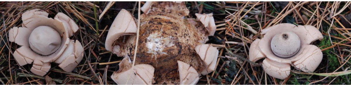 Twijfels over welke aardster dit is.Ik denk dat het de gewimperde aardster is.creme van kleur, +- 10 cm groot(breed), onder dennenboom.