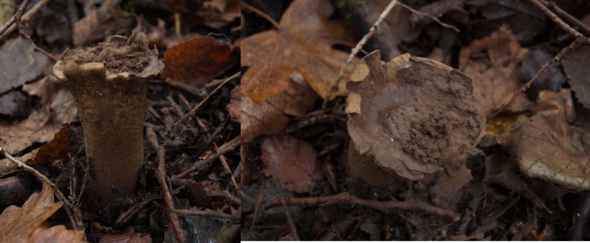 Ik denk dat dit ooit een donkerbruine stuifzwam geweest moet zijn. Wat mij wel opviel is de omvang van dit gedrocht. Was 12 cm hoog en 6 cm doorsnee! Bovenop lag een hele laag met bruine poeder.