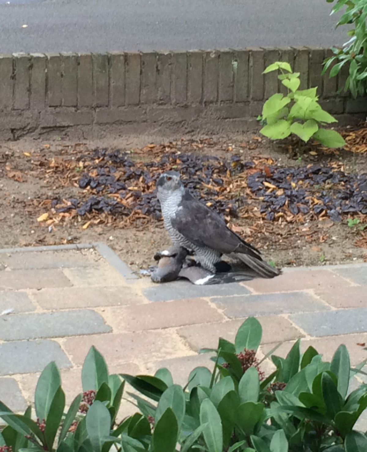 Deze vogel pakte een duif in onze voortuin.Omdat wij binnen de bebouwde kom wonen dacht mijn buurman aan een sperwer, ik denk zelf dat het een havik is.Wie o wie kan dit geschil oplossen?
