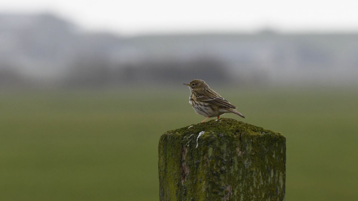 Dit vogeltje zat op een paal in de Hargerpolder . Ik denk aan een graspieper , doch ik mis de witte oogstreep .