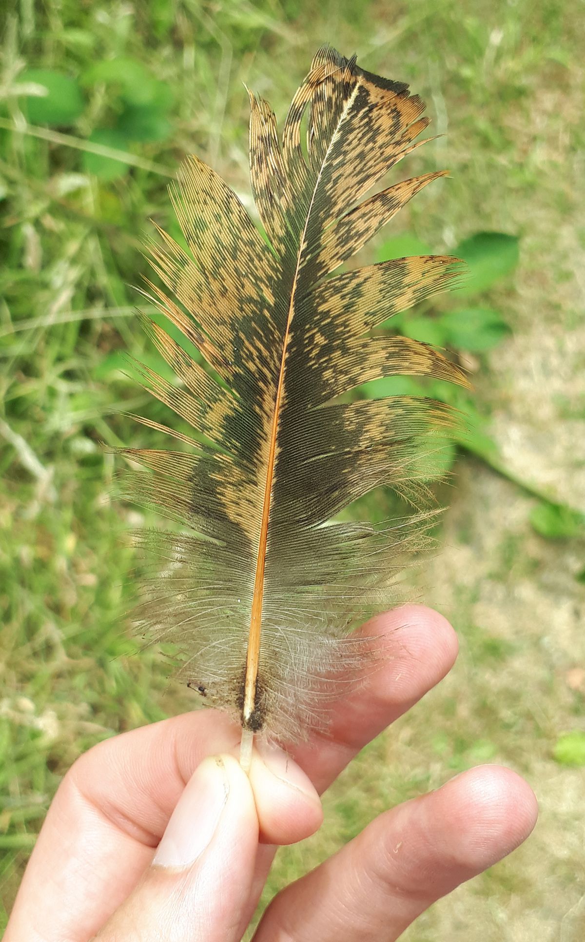Hoi,Ik vond deze veer op een bosrijk pad bij een bedrijventerrein. De veer is zo'n 10 centimeter groot. Hij is bruin met zwarte vlekjes en de bovenzijde is zwart gebandeerd. In het zonlicht glimt hij mooi warm bruin. Iemand enig idee van welke vogel dit een veer zou kunnen zijn? Ik vermoed door zijn...