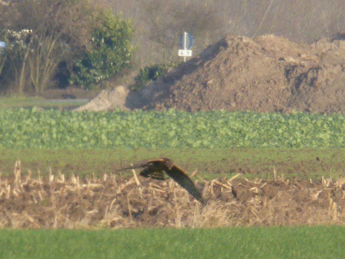 Welke roofvogel is dit?2 weken geleden bij Duiven in de weilanden.foto's helaas niet scherp. Witte plek boven de staart.andere foto