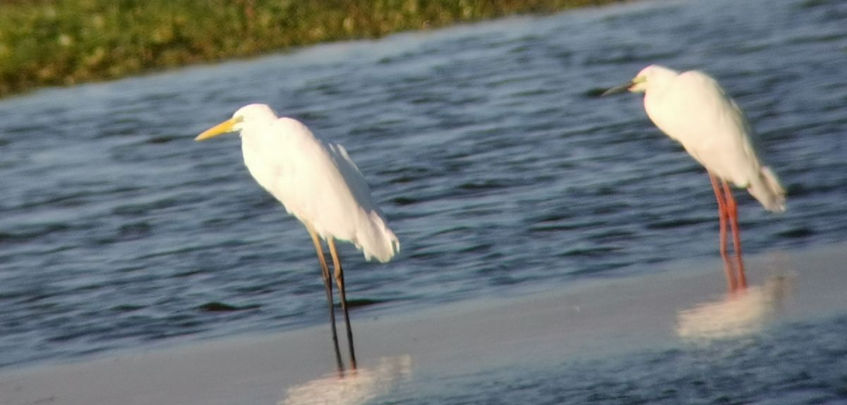 Een grote zilverreiger en een kleine zilverreiger met duidelijk rode poten wat zou dat voor een kunnen zijn zuidlaardermeer gebied.
