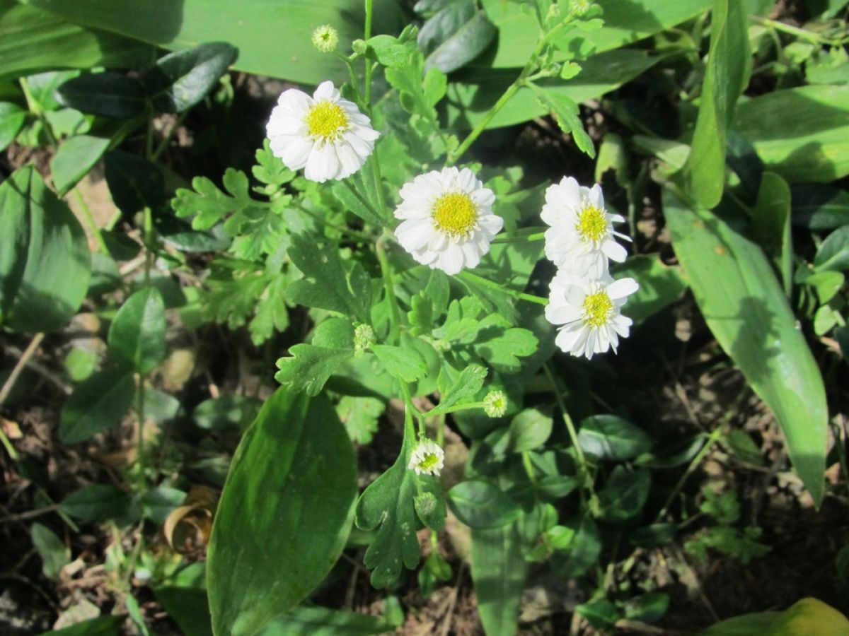 Dit is moederkruid (Tanacetum parthenium), een rijke bloeier met een onmiskenbare geur.