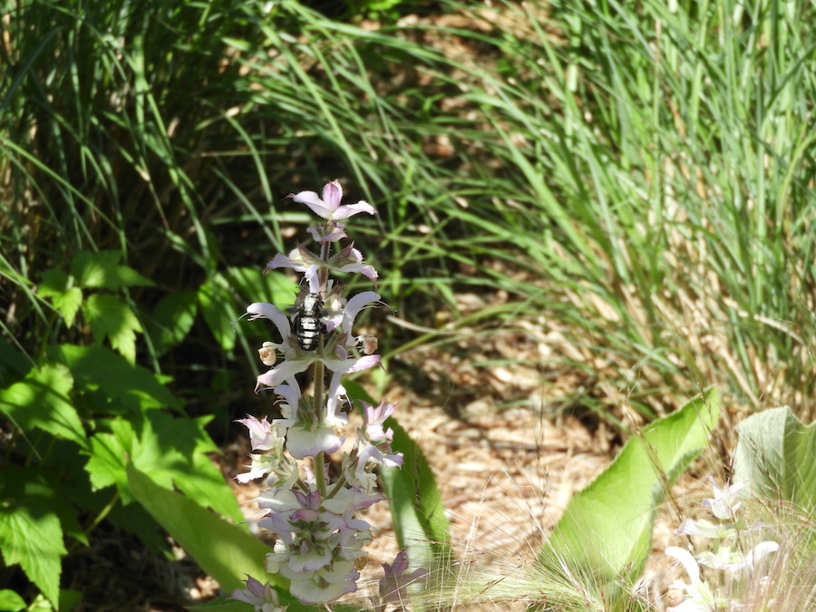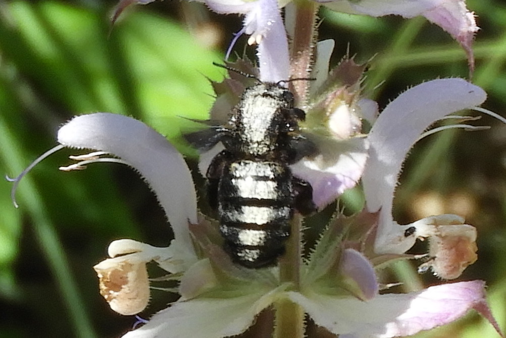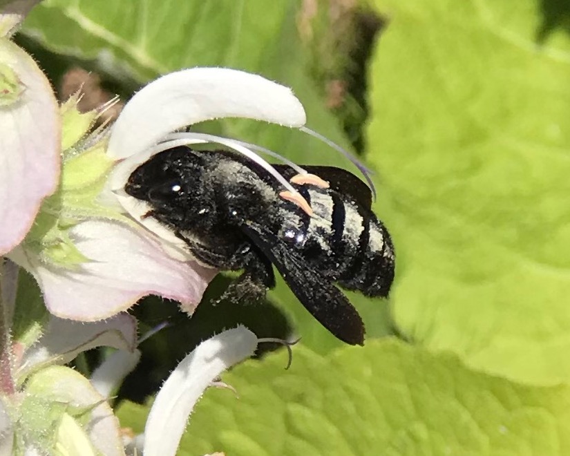 Volgens mij is dit toch een blauwzwarte houtbij en dan eentje die helemaal onder het stuifmeel zit. Bij de uitvergroting is toch ook wel te zien dat het poederachtige korreltjes zijn en niet egaal verdeeld.