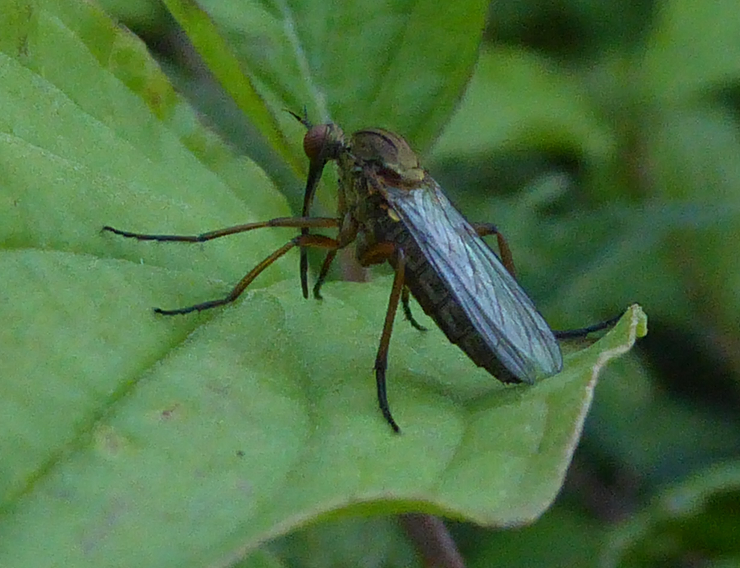 Vanmorgen aangetroffen op (waarschijnlijk) blad els. Er stond verder veel riet, braam, akkerdistel, grote brandnetel. Al zoekend kwam ik bij Empididae (dansvliegen) uit. Borststuk donkerbruin met zwarte strepen (inkepingen), aan de zijkant wat behaard; bruinzwart behaarde poten. Er leek een metaalachtige glans op de vleugels te liggen, maar dat kan ook komen door de lichtval. Ik kon maar twee foto's maken.