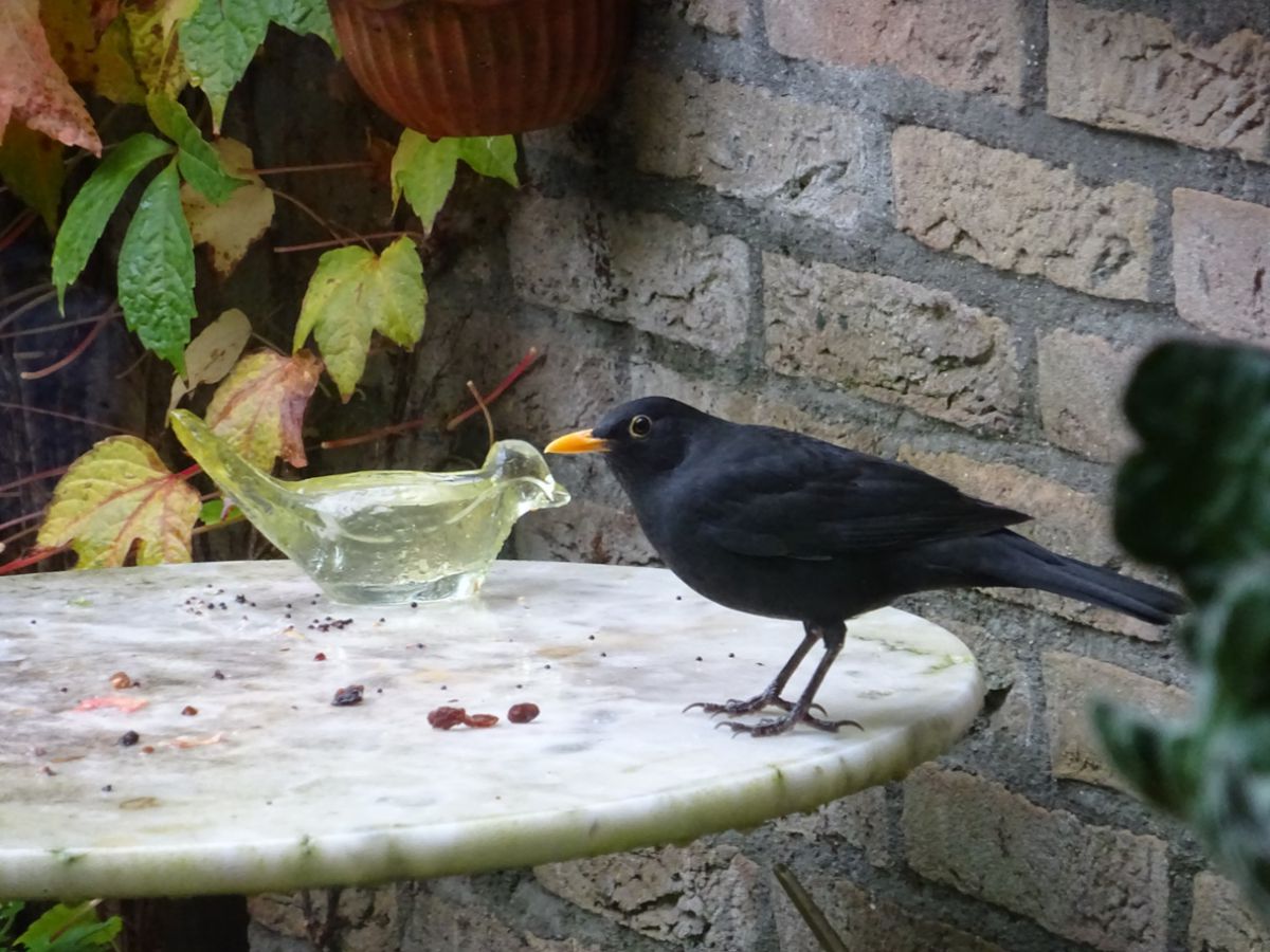 de mannetjesmerel ziet er goed uit, terwijl wij 12 augustus vreesden dat hij aan het heersende virus ten prooi was gevallen. Even kwam zijn vrouwtje nog, maar na een paar dagen bleef zij ook weg.