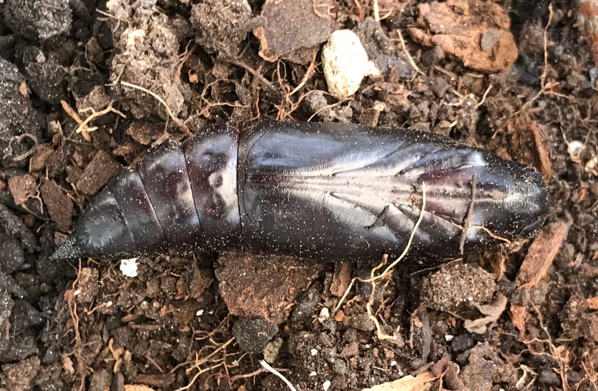 Bij het schoonmaken van de plantenbakken deze cocon aangetroffen. Vorige maand op 10 juli op dezelfde plaats een rups van de doodskopvlinder aangetroffen. Deze hebben we toen ondergronds bewaard. Op 12 augustus is deze uit de grond gekomen en weggevlogen. We hebben dit exemplaar ook met wat grond bedekt omdat we denken, maar niet zeker weten of het ook een doodskopvlinder wordt.