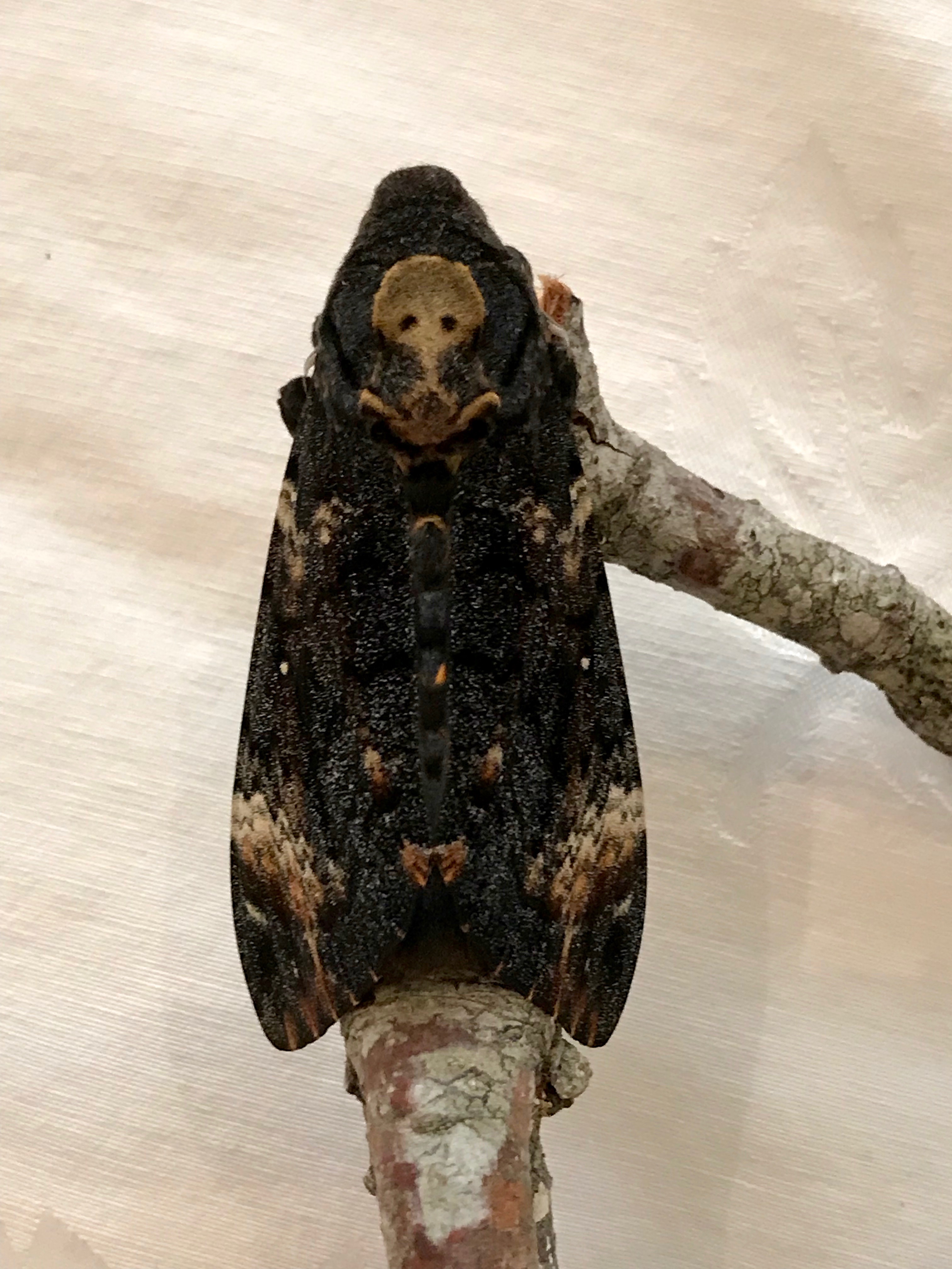 Vannacht heeft de doodskop vlinder zich ontpopt en zit boven in de tak, heeft kennelijk geen haast om weg te vliegen, we wachten maar af en hopen nog een meer actieve foto te kunnen maken.