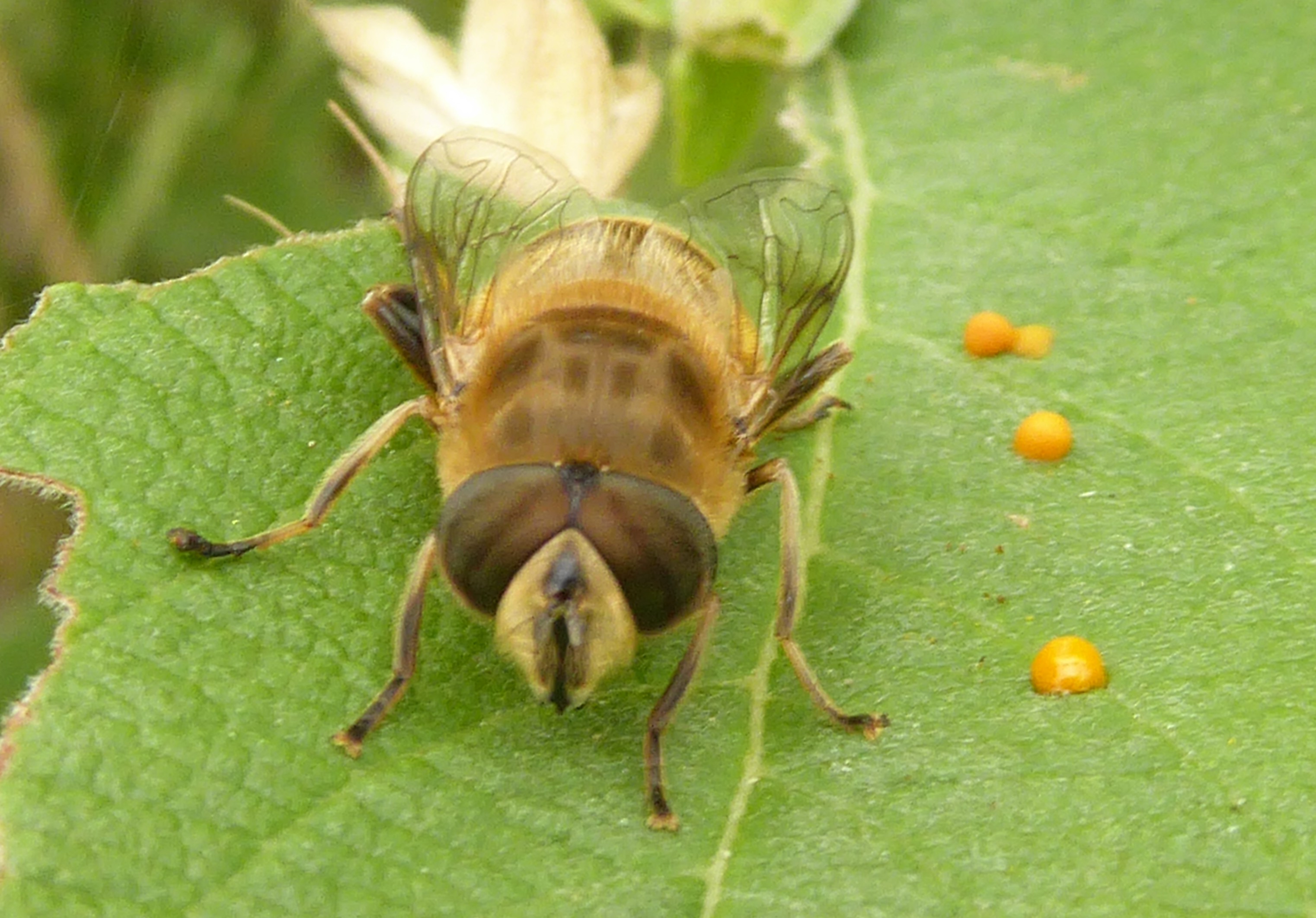 In omgeving bezoekerscentrum Dwingelderveld vorige week woensdag gevonden. Op welke plant weet ik niet meer (tip voor mezelf: noteren na fotograferen). Dit lijkt me geen Volucella bombylans (var. plumata) aangezien de ogen anders zijn.