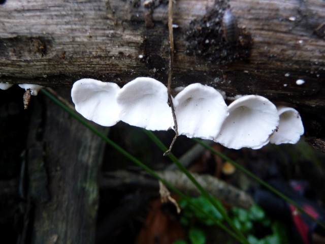 Dit doet me sterk denken aan elfenbankje, maar die is 't als de onderkant wit is, is de onderkant grijs dan denk ik aan de grijze gaatjeszwam. Gr. Dick