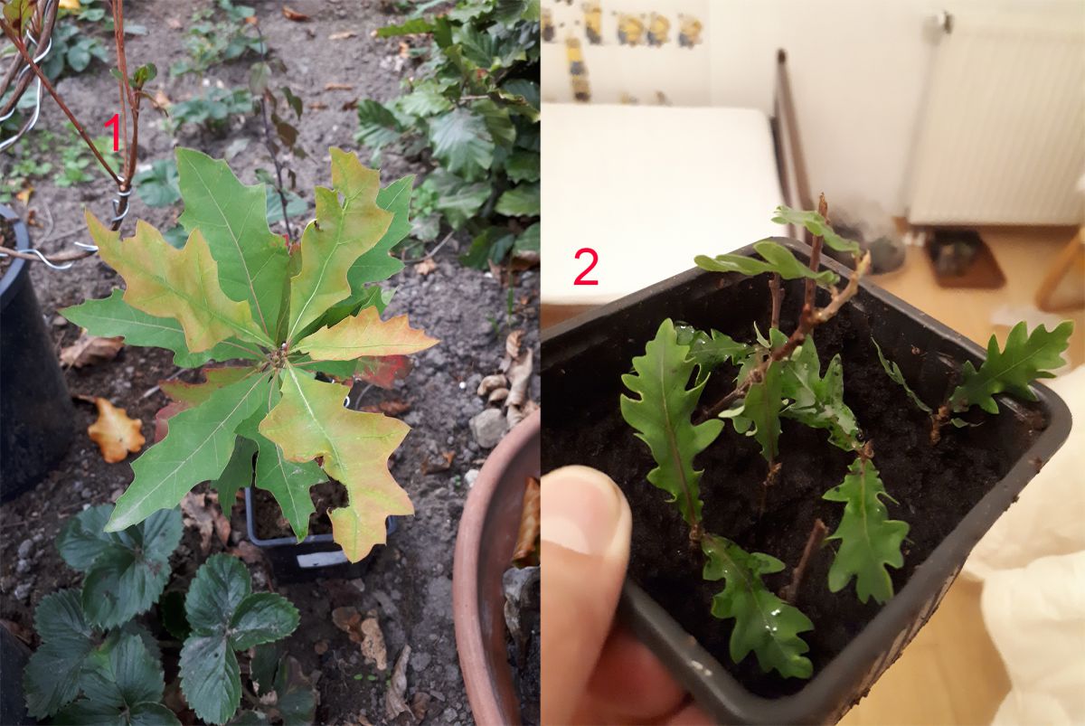 De twee foto's komen van verschillende eiken dus het hoeft niet dezelfde soort te zijn. De stekjes zijn genomen uit natuurlijke gebieden, dus het lijkt me onwaarschijnlijk dat het iets exotisch en aangeplants is.