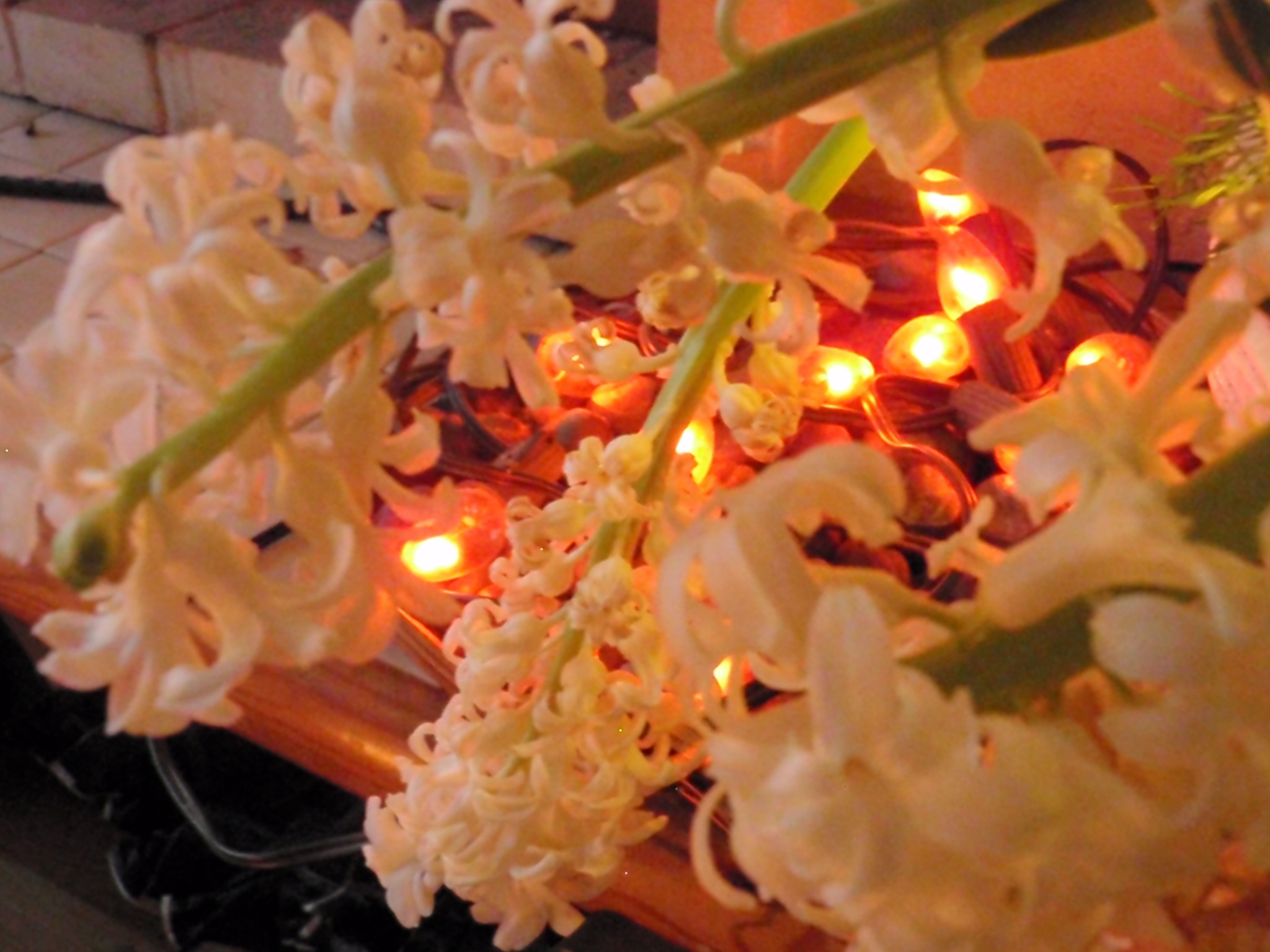En....buiten is het donker, koud en miezerig, maar binnen bloeien de Hyacinten en geuren zo lekker.