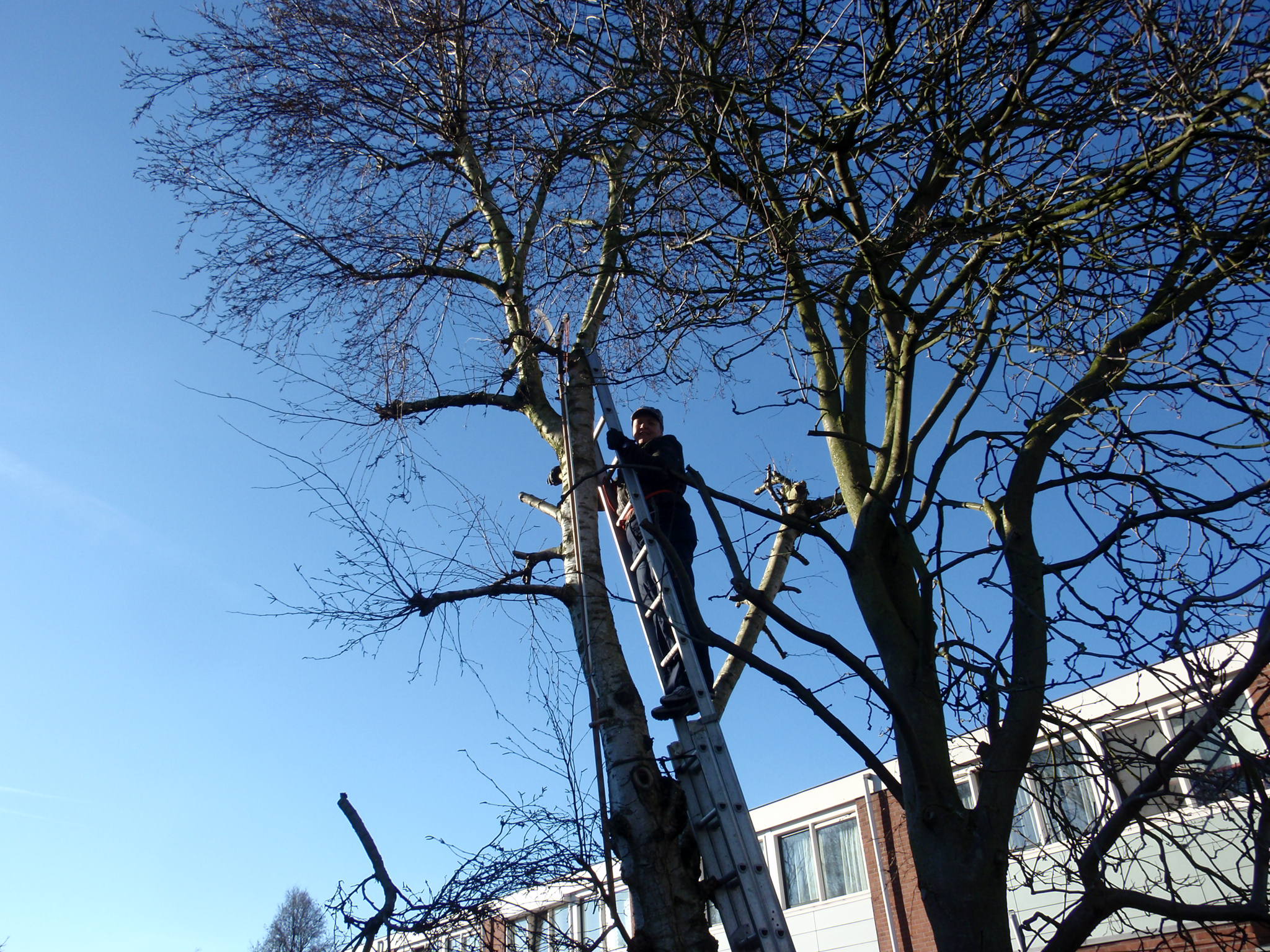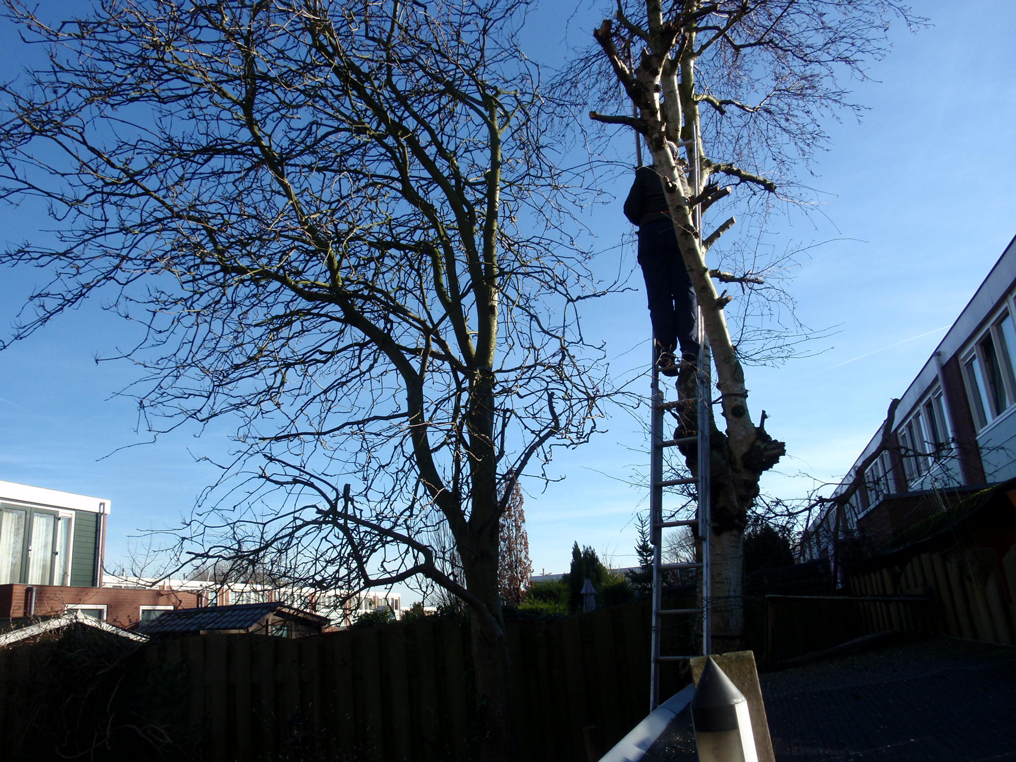 Hallo, de Berk wordt door onze dochter Raldi gesnoeid, zij is met een gordel veilig om en de ladder staat ook gebonden vast aan de boom, Het is wel een eng gezicht zoals zij daar in klimt. Soms denk ik dat er nooit meer groene takken zullen groeien, maar wonder, elk jaar weer volop groen.
