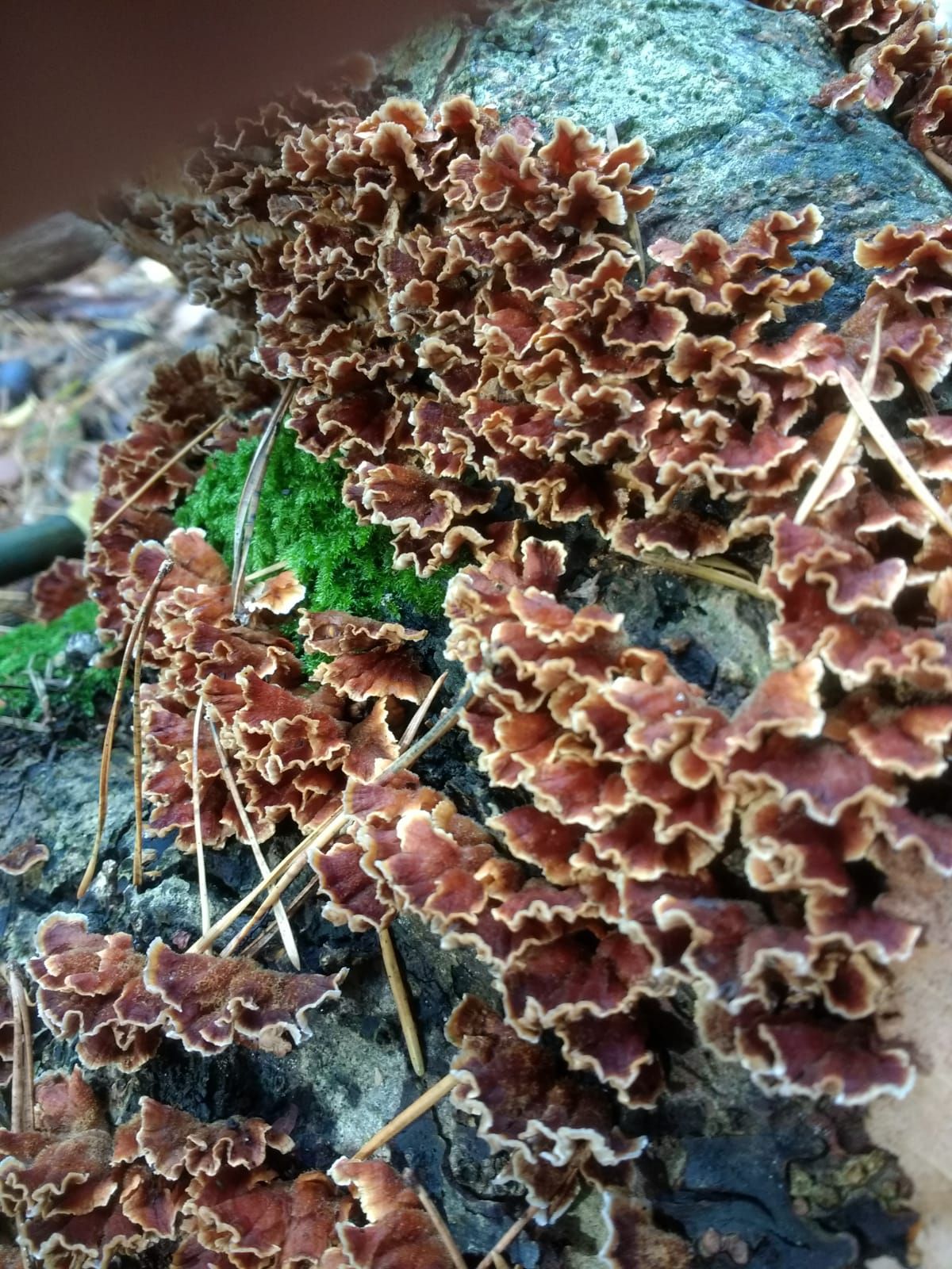 De schijnhoedjes van de waaierkorstzwam zijn 3 tot 7 cm en die van mijn korstzwam maar hooguit 2 tot 3 cm...
