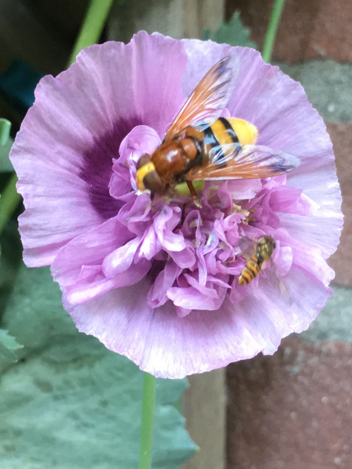 Aan de “gele neus” te zien, zal het waarschijnlijk een Stadreus of Hoornaarzweefvlieg/ Volucella zonaria zijn bij Bels lijntje in onze schônste stad van ‘t laand. ;-)