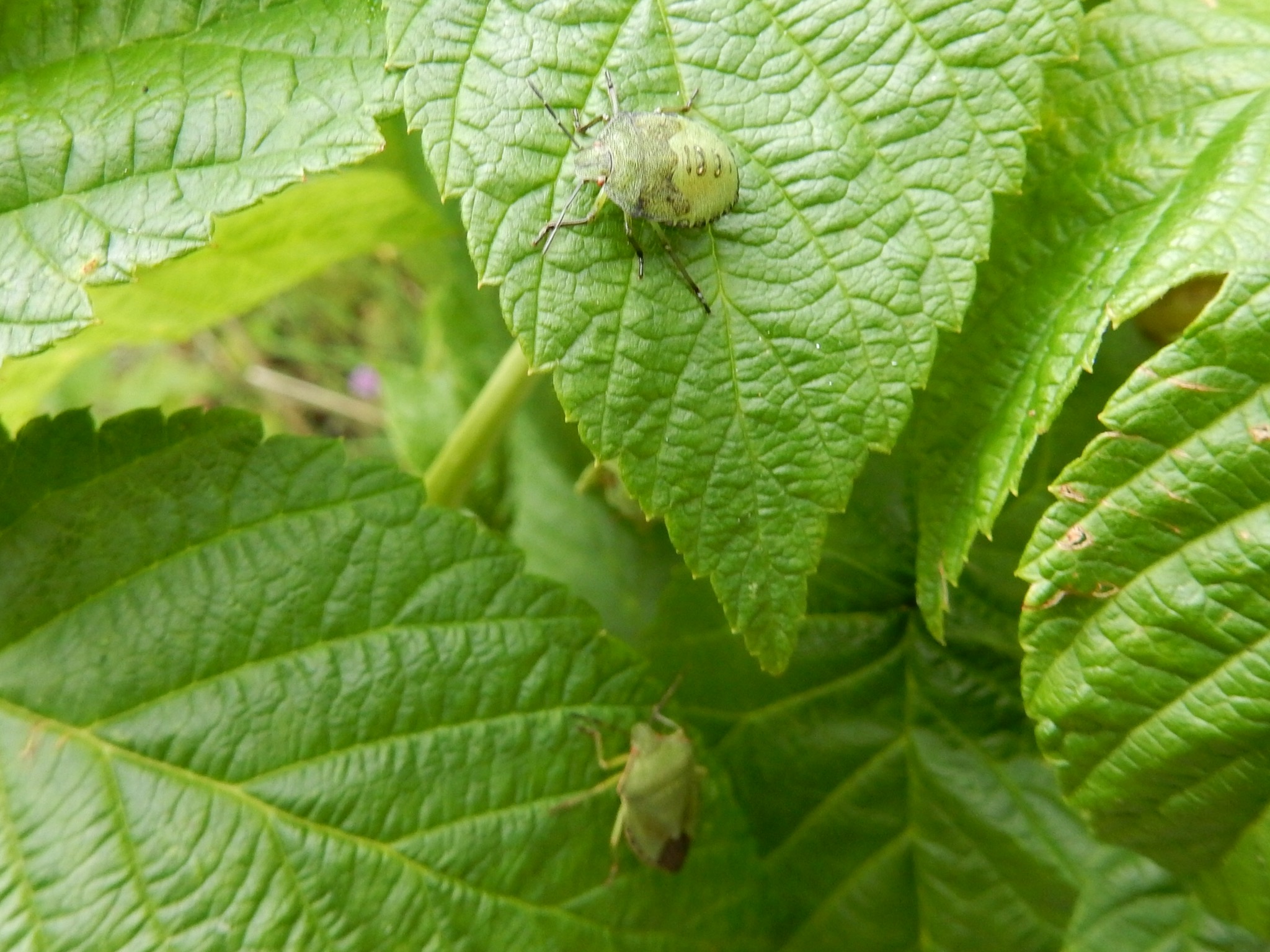 Deze wants wordt ook wel Groene stinkwants genoemd en er zitten er elk jaar wel enkele op de frambozenplanten. Ik doe er een foto bij waarop de imago kleiner lijkt dan de nimf (vanwege afstand)