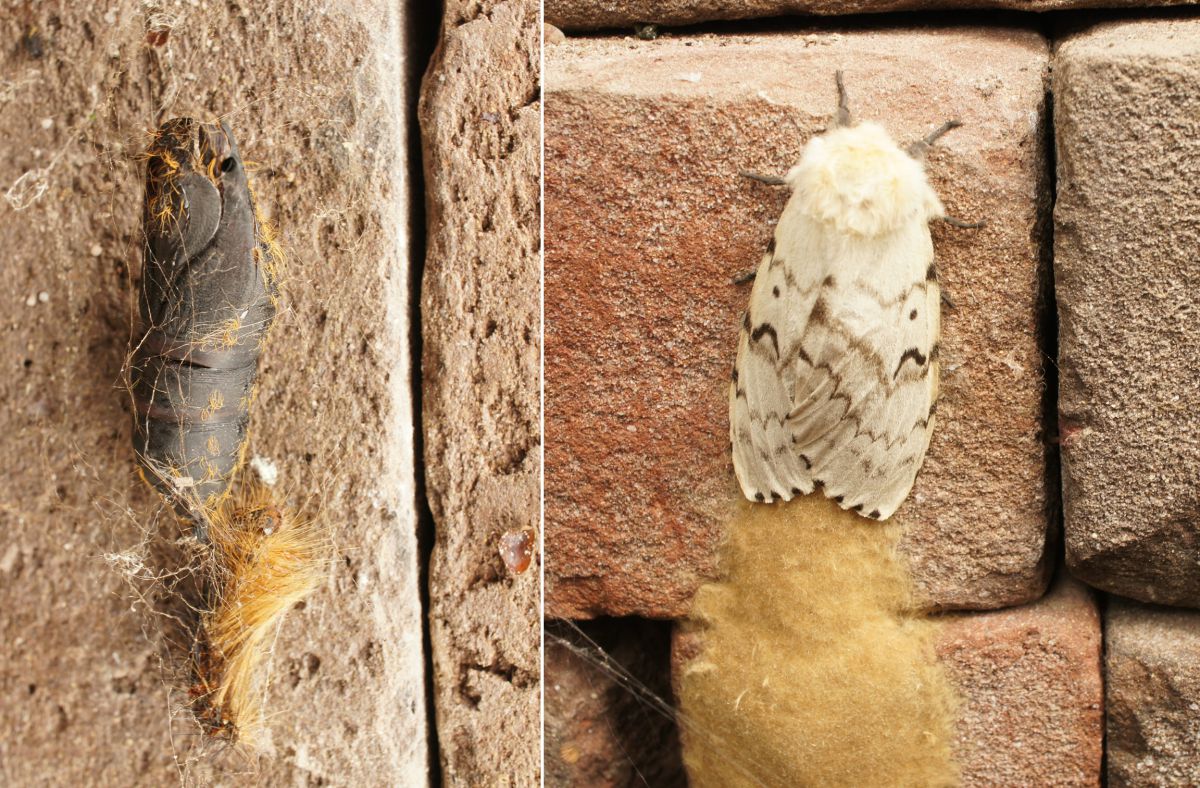 Het beestje zat tussen een stapel klinkers, net uit de pophuid gekropen die ertegenover zat. Er zat ook een lang viltachtig spoor onder hem, restanten van zijn transformatie? Plaats: boerderij aan de voet van de Sallandse Heuvelrug. Datum 29 juli.