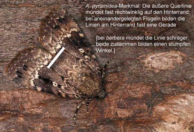 Voor de twee hier genoemde Amphipyra's wordt dat gesteld. Maar er zijn subtiliteiten waarmee de twee uit elkaar te houden te zijn. Eén daarvan wordt hier aangeduid, maar daar zitten weer wat haken en ogen aan. Je moet als je het op die manier bekijkt heel goed oppassen dat de stand van de vleugels invloed heeft op de hoek in die lijn. Vergelijk de foto's van pyramidea en de foto's van berbera op Lepiforum. Bij foto's van pyramidea waarbij de vleugels meer over elkaar geschoven zijn wordt vanzelf de lijn geknikter, zoals die bij berbera zou zijn wanneer de vleugels netjes tegen elkaar aan liggen. Dat is dus zeer hachelijk!