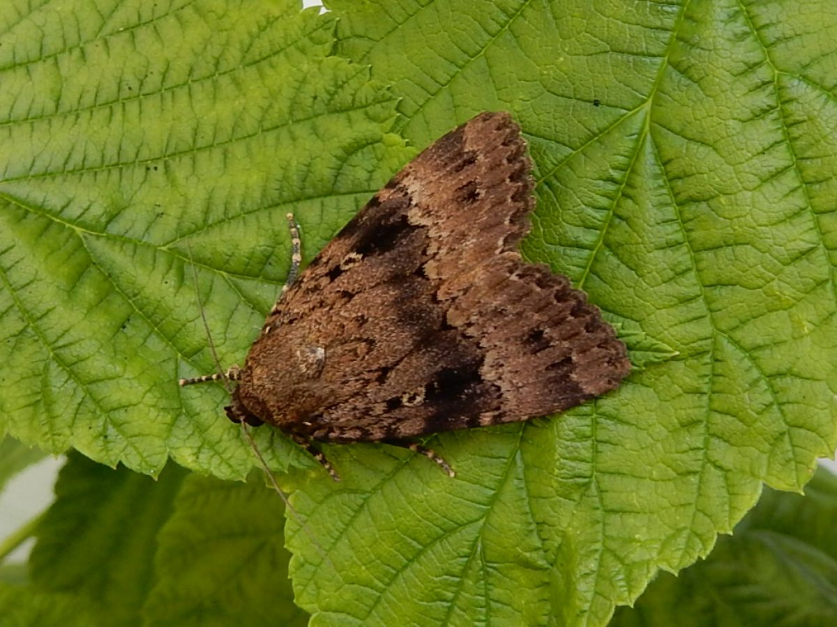 Ja hoor, dit is een Huismoeder / Noctua pronuba, nachtvlinder die overdag en ‘s nachts actief is, is vaak herkenbaar aan donkergele achtervleugels met zwarte band die je alleen ziet als vleugels gespreid zijn. (Jeanette had smalle randje daarvan goed gezien!)