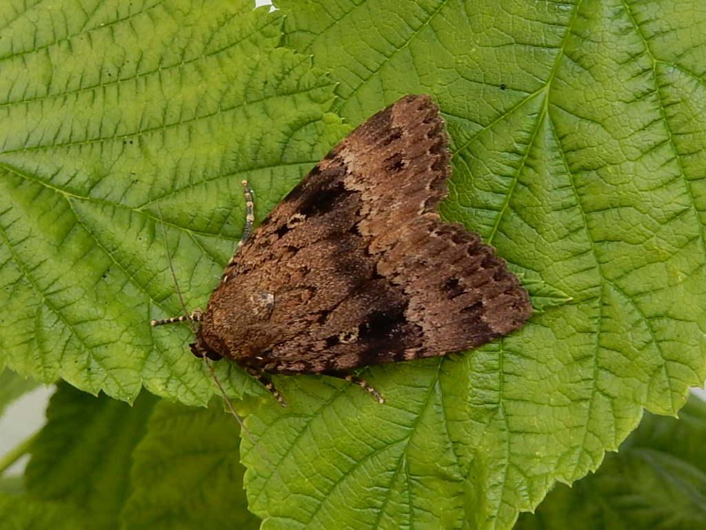 Maar nu meen ik dat ik eveneens een piramidevlinder heb gefotografeerd op frambozenplant in de tuin. Ik heb op veel sites en in mijn vlindergidsen gezocht en kom steeds bij deze soort terug. Wat denken jullie, is het mogelijk ook een Amphipyra pyramidea? Heeft de vlinderzoektocht toch weer leermateriaal opgeleverd!
