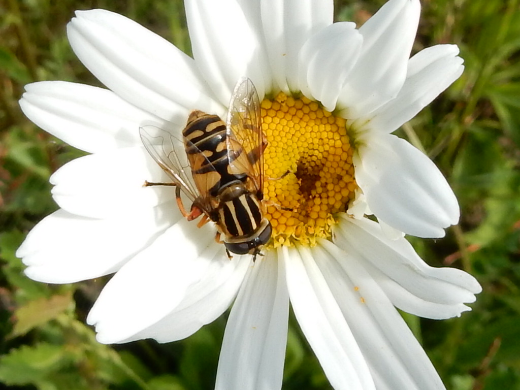 Na lang zoeken (wat zijn er ontzettend veel zweefvliegen!) kom ik uit op gewone pendelvlieg [Helophilus pendulus] . De tekening van het achterlijf is nogal typerend en de achterpoten hebben een lichter gekleurd gedeelte.