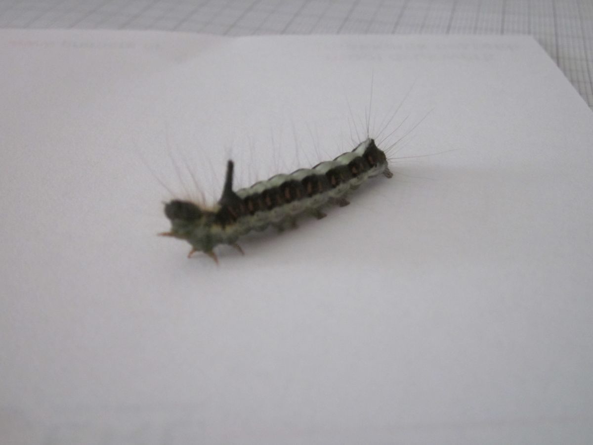 Vanmorgen ontdekte ik deze rups op de mat in ons theehuis. In eerste instantie dachten we aan een pijlstaartrups, maar de 'pijl' zit vlak achter zijn kop. Er loopt een witte streep over zijn rug en in de donkere banden aan de zijkant zitten oranje vlekjes. Ook is hij vrij langharig.