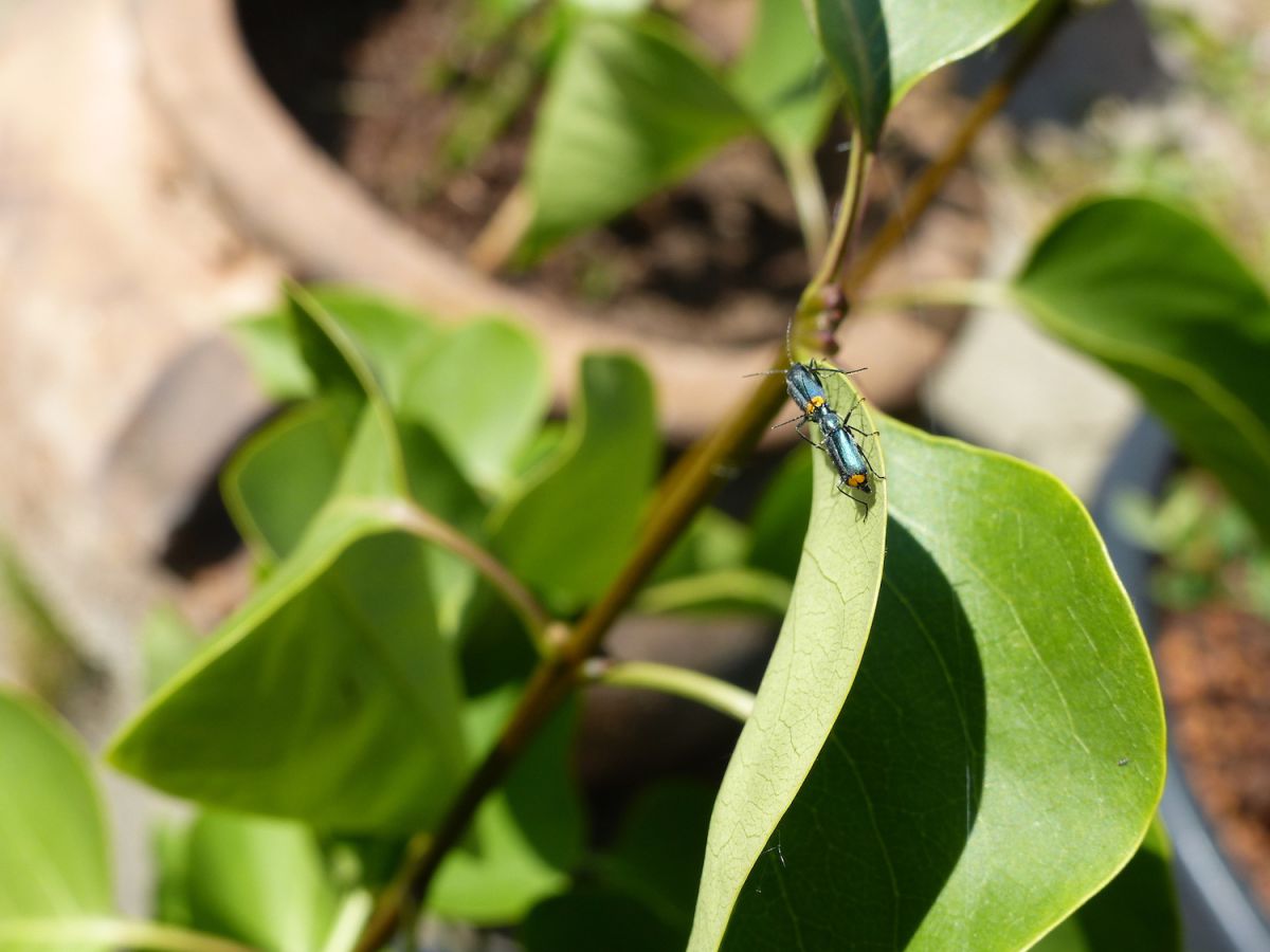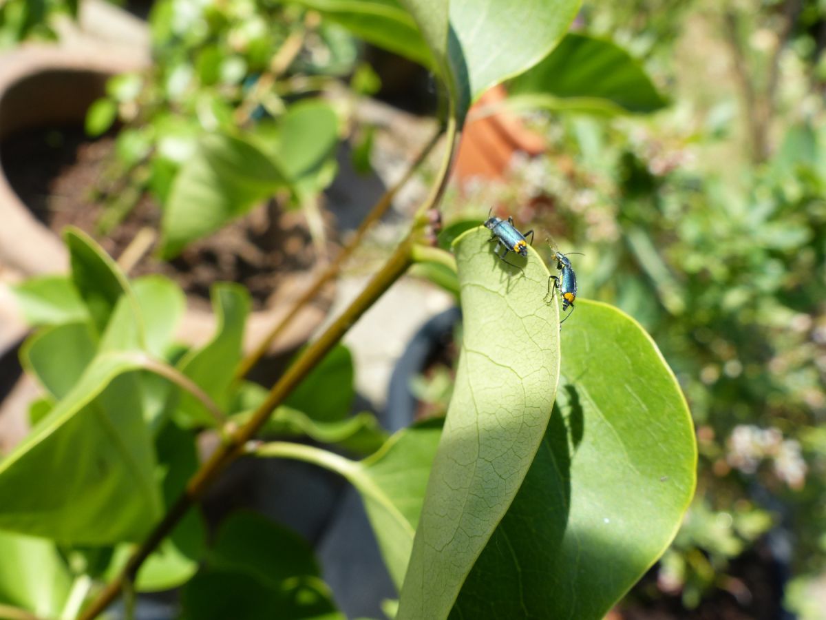 Deze 2 kevertjes zaten vandaag op een seringenblad. Ik heb ze nog niet eerder gezien, Mooi, glanzend turquoise schild en twee gele bolletjes (volgens mij niet de ogen), Is het een soldaatje of familie van de kniptor? Vooral de contrasterende kleurstelling glauw- geel viel op. Ze vlogen later weg. Wat zijn dit voor insectjes? Ik kan het op internet niet vinden.