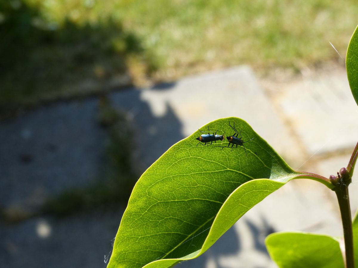 In de tuin, in Simpelveld, Zuid- Limburg. Ik heb ze vandaag niet meer gezien en volgens mij waren ze inderdaad aan het paren. Ik doe er nog een andere foto bij, zij- aanzicht, omdat dit er ook interessant uitziet. Het lijken net een soort wespjes hier, maar het waren echt keverachtige insectjes.