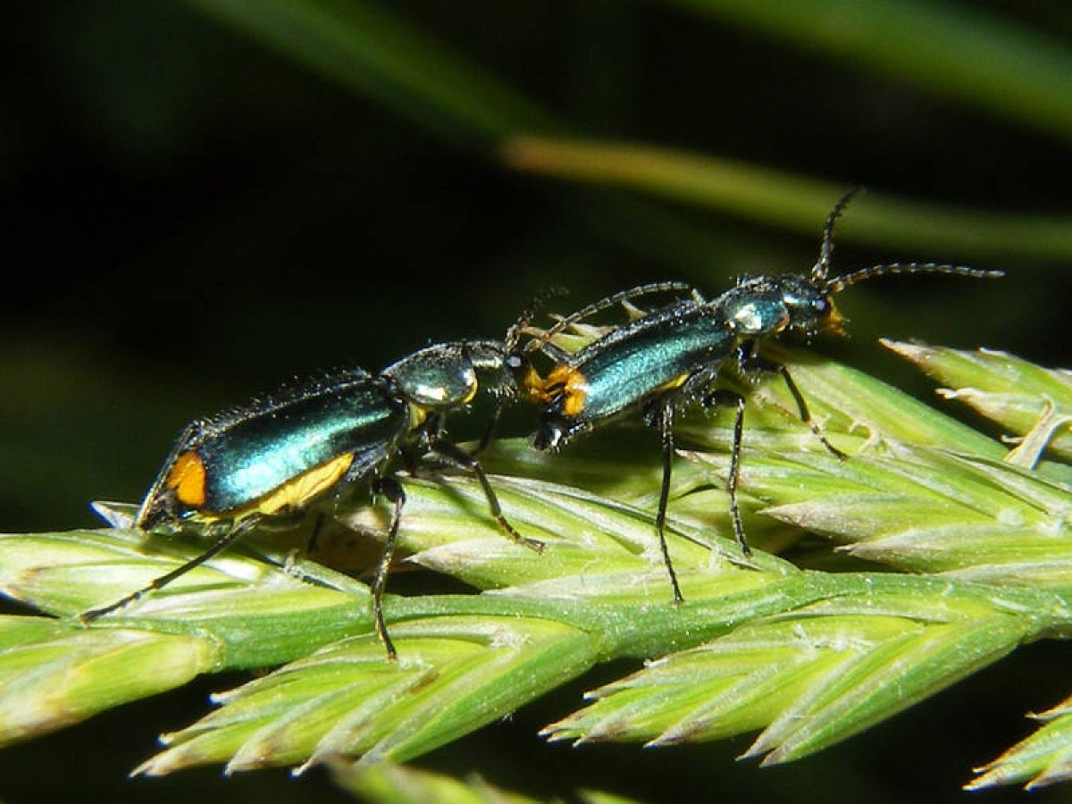 Deze 2 kevertjes zaten vandaag op een seringenblad. Ik heb ze nog niet eerder gezien, Mooi, glanzend turquoise schild en twee gele bolletjes (volgens mij niet de ogen), Is het een soldaatje of familie van de kniptor? Vooral de contrasterende kleurstelling glauw- geel viel op. Ze vlogen later weg. Wat zijn dit voor insectjes? Ik kan het op internet niet vinden.