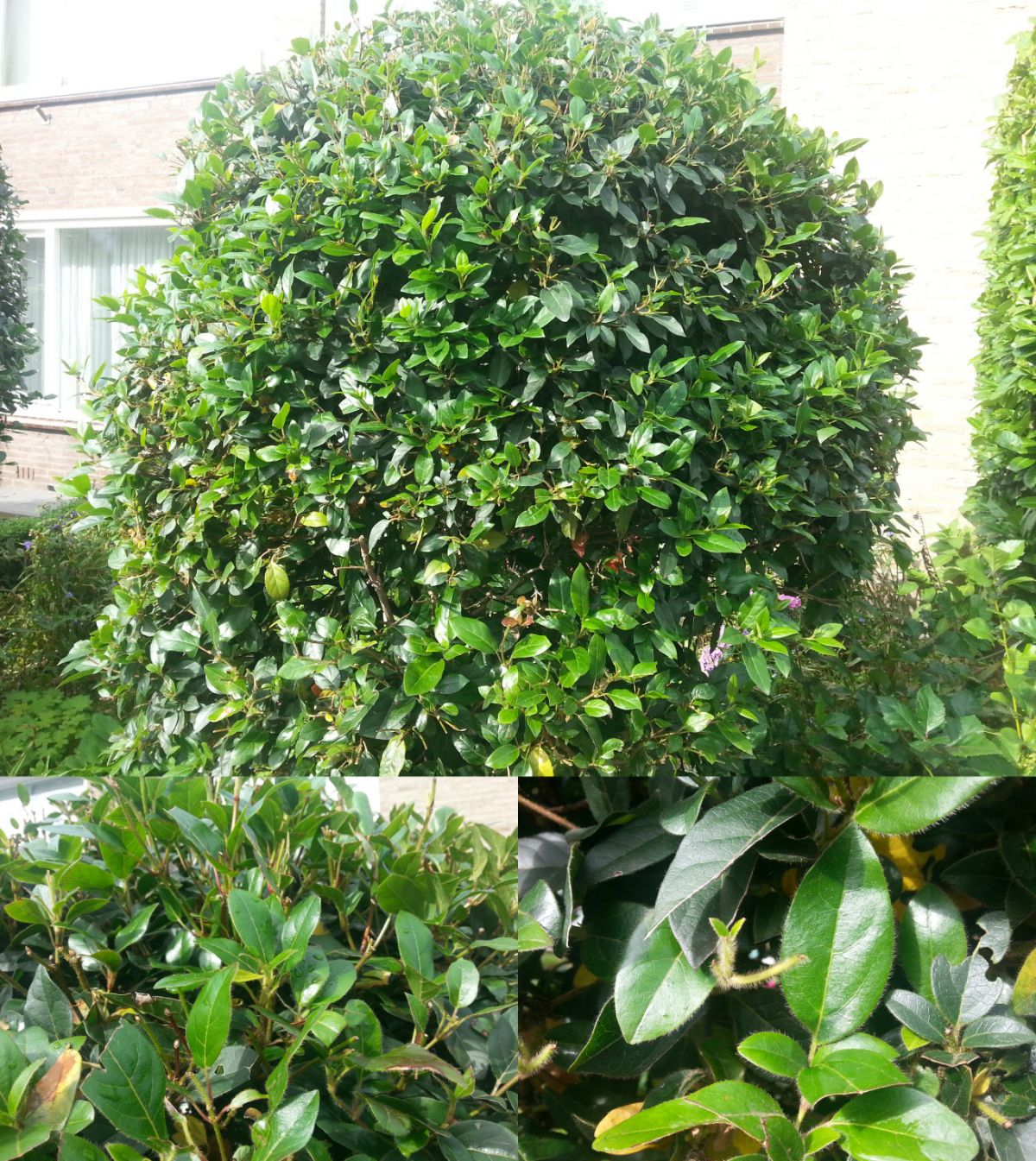 Ik kreeg via de app het antwoord dat dit Hulst zou zijn. Maar dat lijkt mij niet. Misschien door de vorm waarin de struik gesnoeid is? Maar de bladeren zijn heel anders, en er zitten ook nooit besjes in.