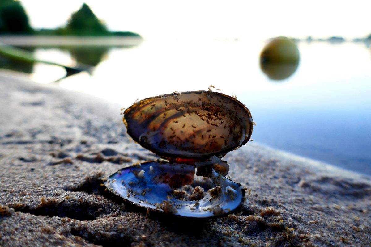 De mossel lag op de scheiding tussen water en land. Hij lag er in het wild boven water.