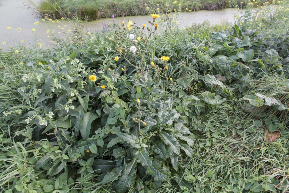 Is dit een akkermelkdistel, een gewone melkdistel of helemaal geen melkdistel? De bladen zijn zoals te zien scherp getand. Naar boven toe wordt de stengel vrij kaal. De plant groeit rijkelijk in de wegberm en is ruim een meter hoog.