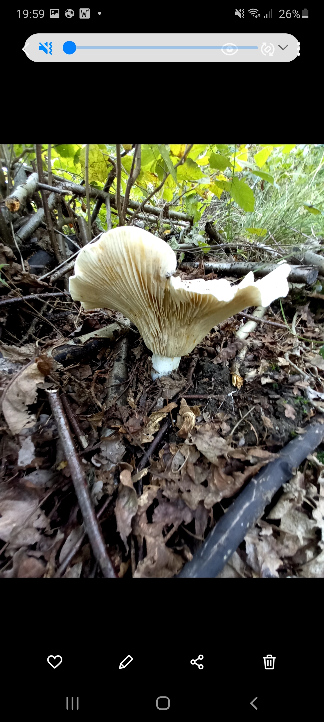 Ik denk aan één van de trechterzwammen. Grote trechterzwam zou kunnen. Gr. Dick