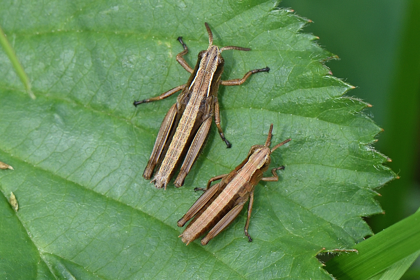 Vermoedelijk jonge moerassprinkhanen (Stethophyma grossum),Gert; die komen voor in zeer vochtige terreinen. Ze moeten nog uitgroeien en verkleuren tot de prachtig volwassen exemplaren.