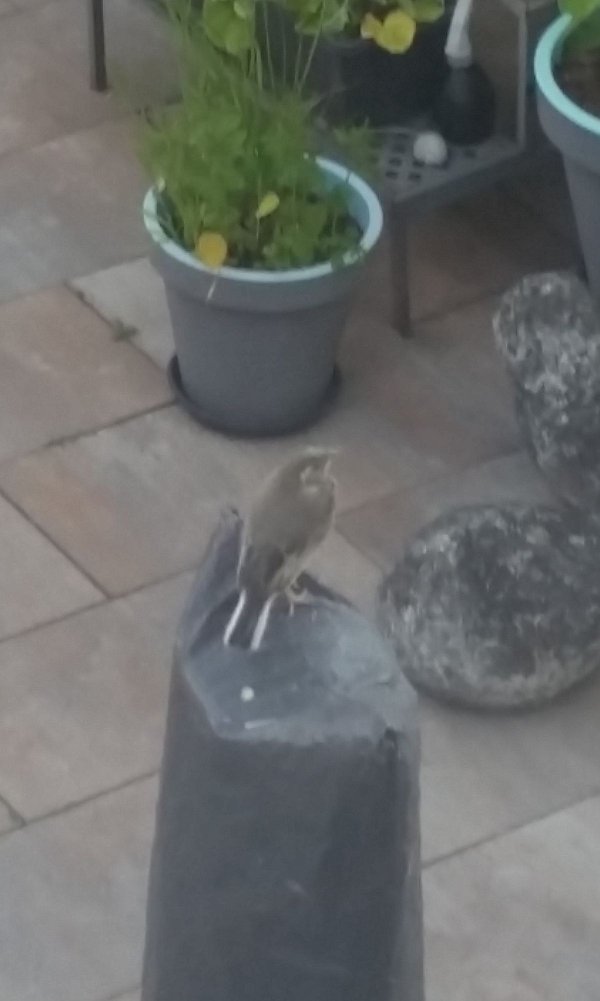 Vanmorgen (25-6-2020 om 6.25 u) zat deze vogel op onze parasol. Raadplegen van boeken en internet bracht geen oplossing.