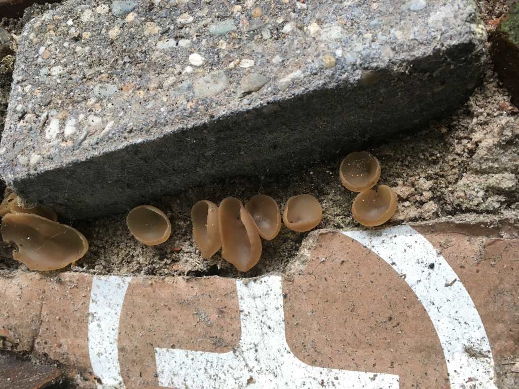 Wie weet welke zwam (want het is volgens mij een zwam) dit is? Ik twijfel tussen gewoon varkensoor en bekerzwam. Ze zijn klein, rond de 2/3 centimeter. Ze groeien in ons tuintje in Amsterdam. Het is er erg vochtig en er komt geen direct zonlicht.