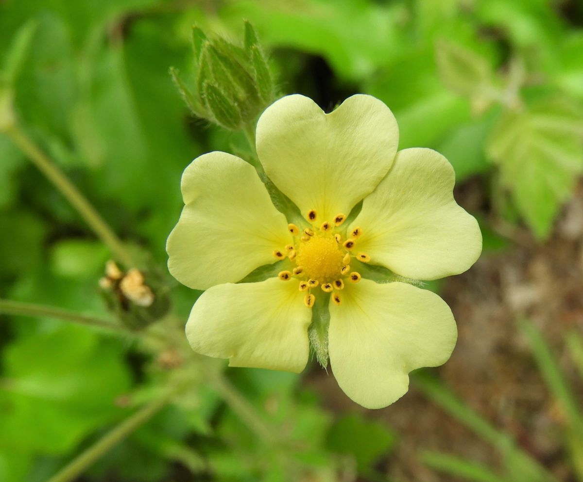 De bloemetjes zijn licht geel en hebben lange steeltjes met hartvormige vijf bladige bloemen.